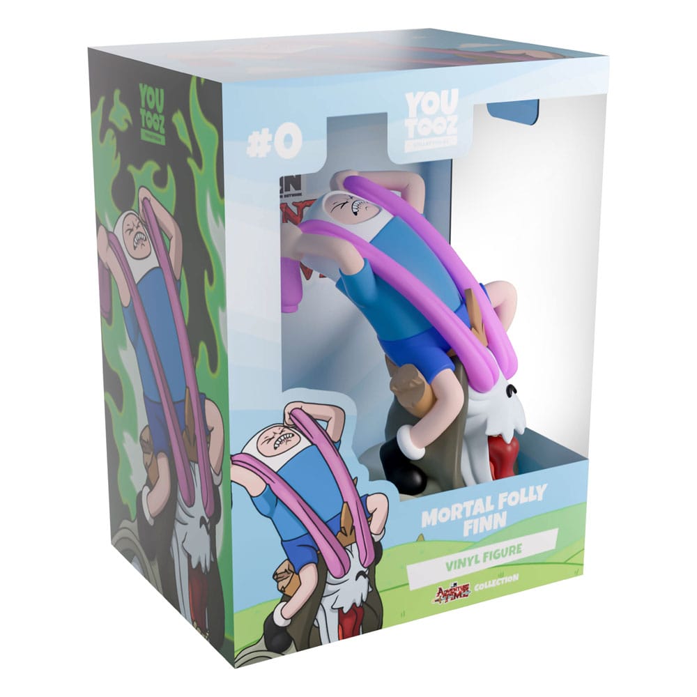 Finn’s not messing around as he kicks some absolute butt with his Youtooz debut! Throwing his body back at 4.3 inches tall with a look of pure determination crossing his face that can only be obtained by liking someone a lot, he grips the sleeves of his bright pink sweater which he’s threaded through the Lich’s eye sockets as he wears his iconic blue shirt and shorts along with a white hat. While helplessly below Finn and letting out an agonising scream, the Lich’s grey face contorts from the pain of his defeat as brown horns stick out from either side of the pointed crown that sits atop his dark green hooded head. The exterior of his packaging sees the Lich firing a green flame directly at a sweater wearing Finn. While the interior is covered in a light blue and white sky which makes its way onto the protective sleeve above a rolling green field as his figure can be seen through the large clear window at the packaging’s front. This collectible was designed in collaboration with community member @therealracckun and ships in a matte, embossed, protective outer sleeve and a custom-sized plastic protector for maximum protection during shipping.