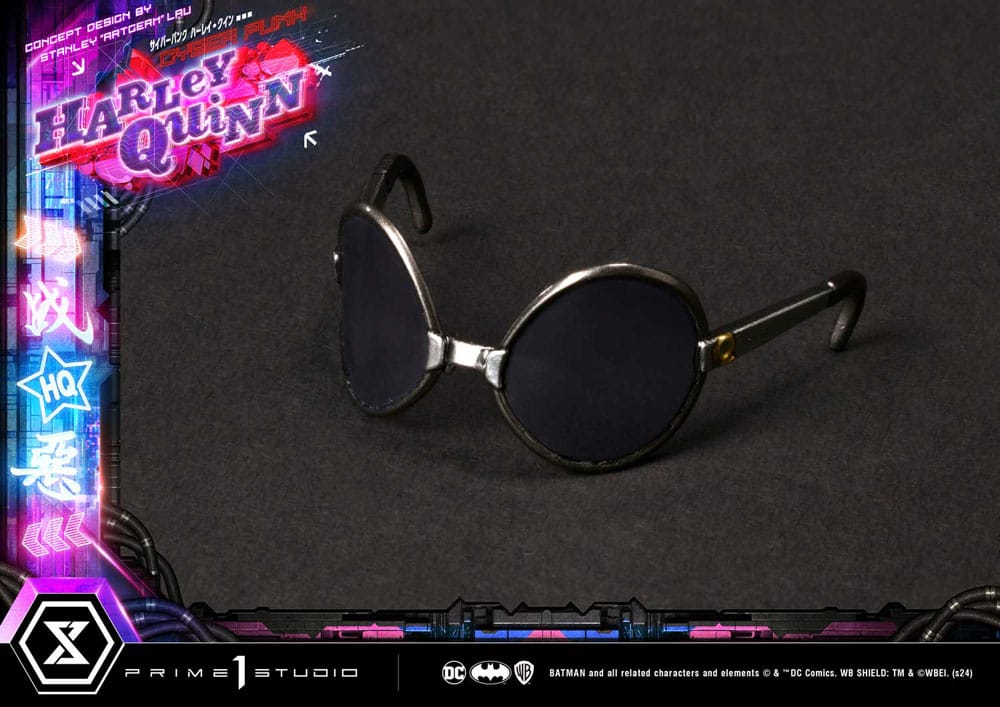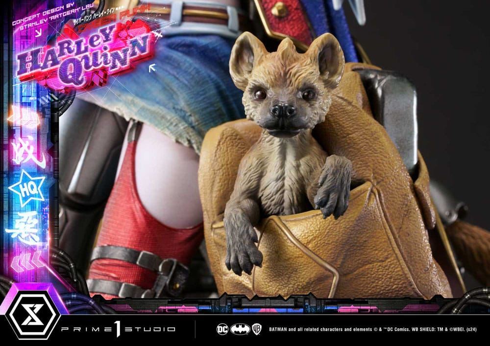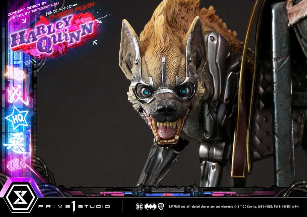 Standing over 24 inches tall, this new and improved Harley has been redesigned from head to toe. Her edgy yet playful demeanor is captured in her striking stance, her weapon wedged snugly between her elbows and back as she makes the horn gesture with both hands, exuding a subtle blend of ease but also confidence. Pretty much like every other denizen of Cyberpunk Gotham, she is augmented with cybernetics, technological modifications applied to the human body for improved physical and mental capabilities, blurring the lines between man and machine. Her right-side appendages have been enhanced and completely swapped by cyborg prosthetics. Her attire has also been redesigned to fit her avant-garde futuristic fashion style, while still retaining her signature duality of red and blue. Her initials are featured on the back of her coat. As usual, she is accompanied by her loyal hyenas Bud and Lou, as you can see, cybernetic enhancements aren’t only reserved for humans. They all stand atop a cyberpunk-city-themed base that features LED illumination, it wouldn’t truly be cyberpunk without the neon lights, now, would it? You can display Harley in a softer and poised facial expression or a more rock-edgy tongue-out with the two included head parts, we’ve also thrown in a pair of sunglasses as well as a head base.