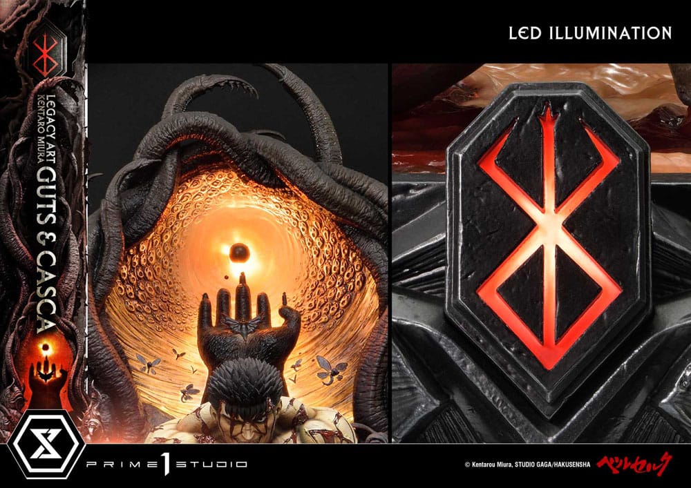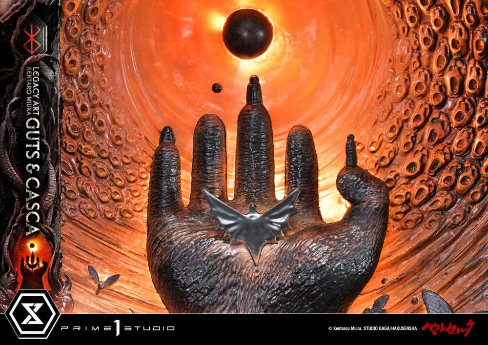 The specially crafted base that captures the horrific Eclipse serves as another main character in this piece. Surrounding the pair are countless apostles, the God Hand stretching towards the sky, and the dark wings emerging from the palm. The Eclipse and the Brand of Sacrifice illuminated by LED, further amplify the eerie atmosphere.