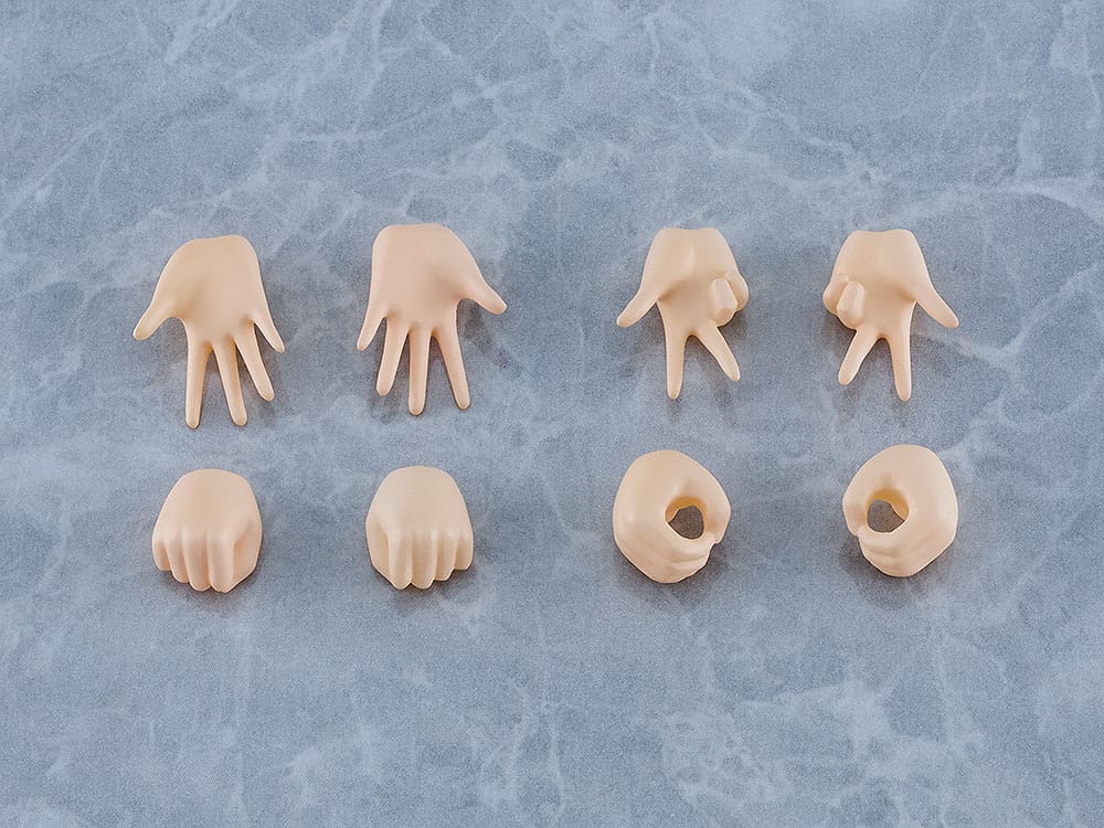 – The model comes with four types of hand parts: closed hands, open hands, peace sign hands and gripping hands. The holes for the gripping hands measure 3mm in diameter, allowing the model to hold items that are compatible with the hole size.