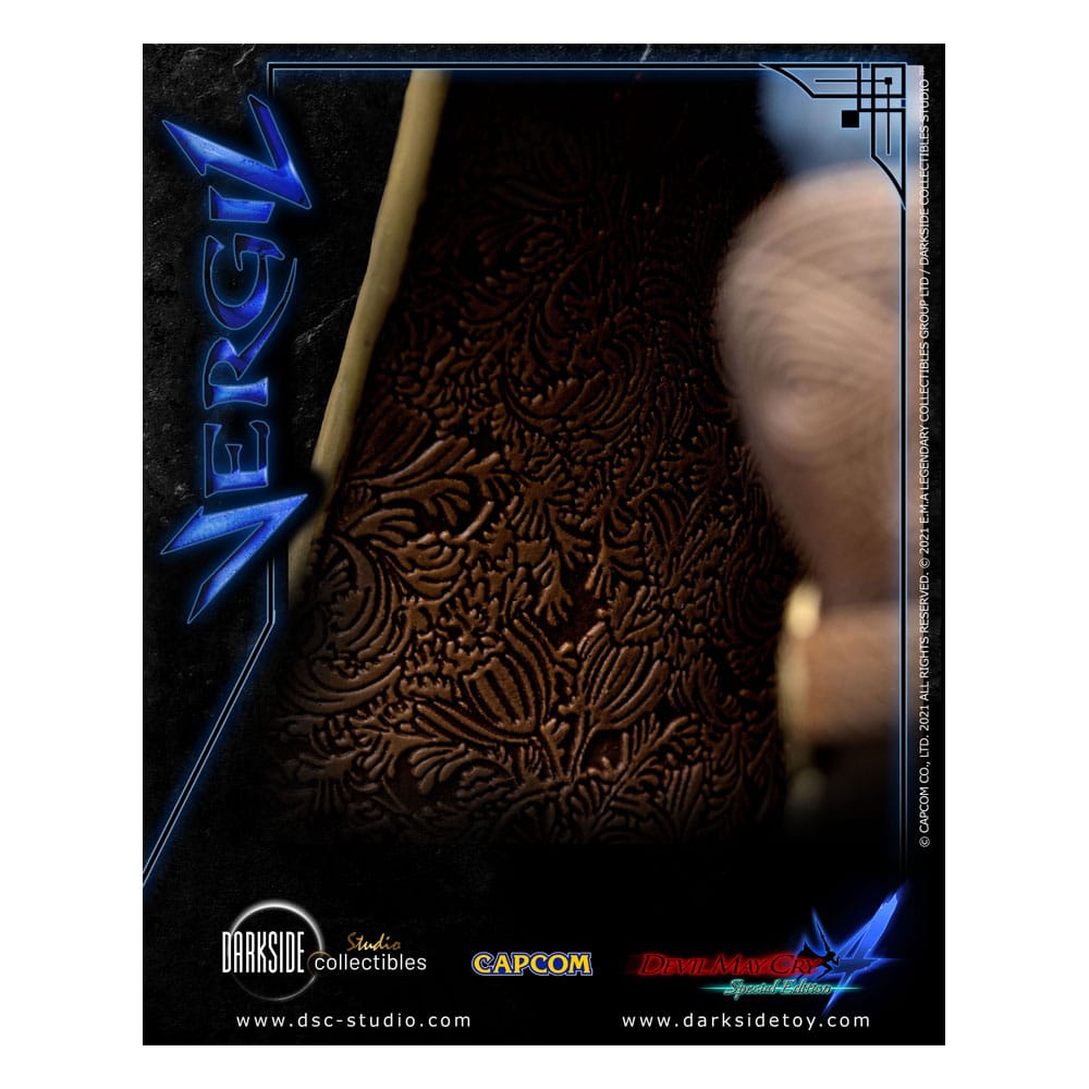 His signature blue coat has been sculpted with stunning accuracy. Details include the serpentine pattern that runs around the collar, the snake head that hangs over the left shoulder and the gold blossom pattern that adorns the inner lining. From head to toe, this Vergil statue has been faithfully crafted to the highest quality.