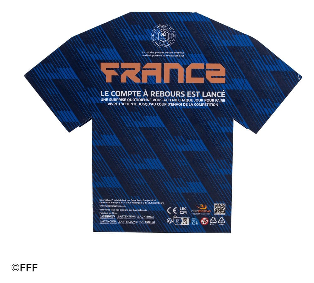This is a Jersey Advent Calendar for the French Football Federation (FFF), manufactured by Cinereplicas. It contains 24 items including Mini Squishy, Shoelaces, Socks, and more.