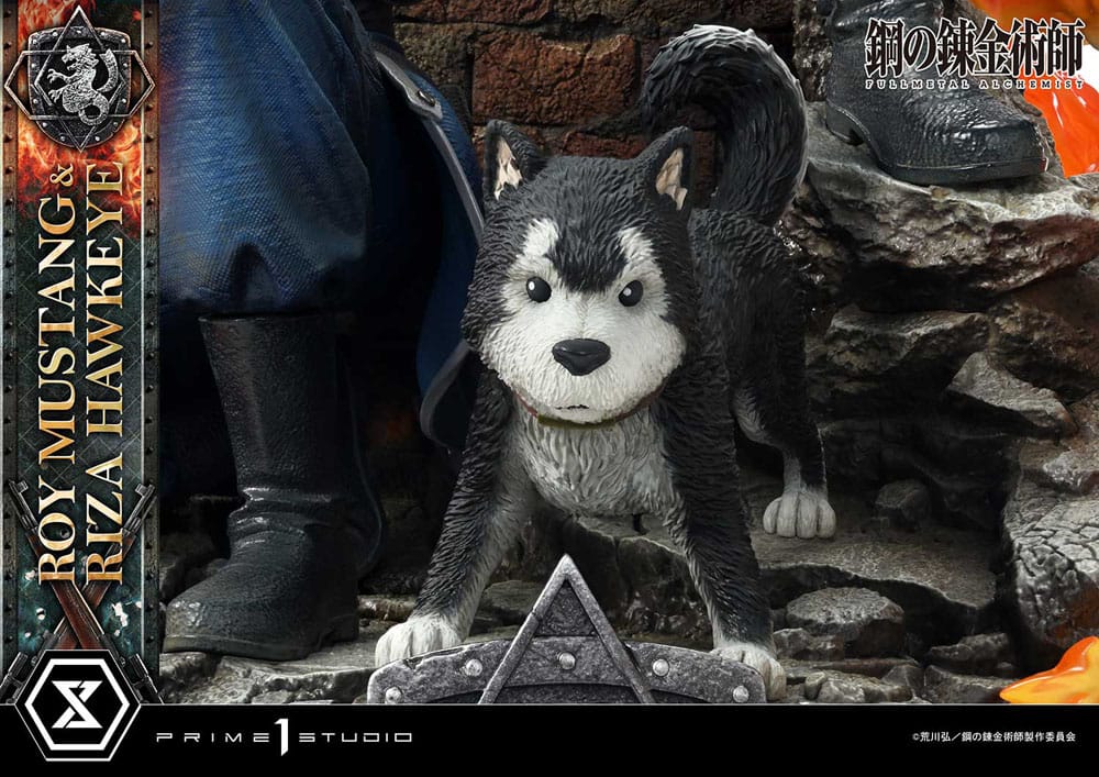 Our artisans at Prime 1 took extreme care in designing and capturing the dynamic energy of Roy Mustang and Riza Hawkeye in action. Roy, the charismatic and ambitious Flame Alchemist, leaps into action with a great sense of composure, hand outstarted – sparkles surrounding his outstretched hand as he prepares to unleash devastating fire magic. Riza, the loyal lieutenant, is crouched on one knee, providing cover fire, her sharp eyes focused, ready to strike with her rifle. Their deep bond and mutual trust are at the heart of many pivotal moments in the series, and we’ve strived to recreate that in this beautiful sculpt. Like always, our experts pull no punches when it comes to bringing drawn characters to life – the textures and shading of every type of material on the characters are carefully thought out and executed to minute perfection, from the wrinkles of Colonel Mustang’s Amestris military uniform to Lieutenant Hawkeye’s rifle wood grain. Let’s not forget the two of them are protected by the brave and energetic Black Hayate – How cute!