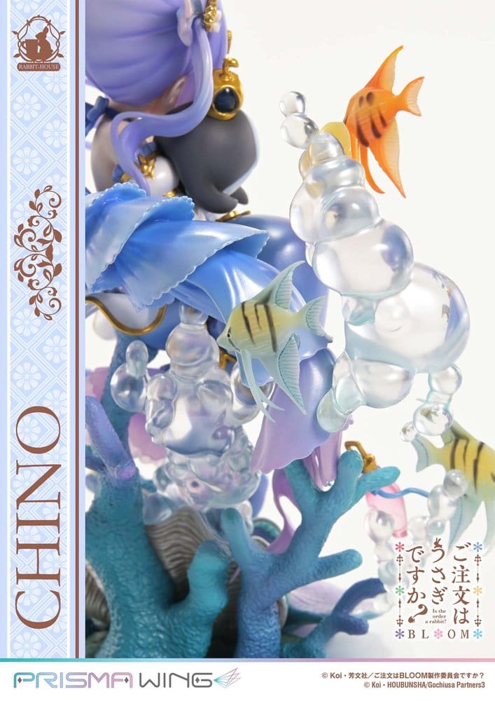 A Cool and Adorable Little Mermaid. The Storybook Illustration of “Chino” Makes Its Figure Debut From “Is the Order a Rabbit? BLOOM,” the storybook-style illustration of “Chino,” inspired by a little mermaid, has been brought to life as a figure for the very first time. From her gentle facial expression and carefully composed pose to the vividly colored undersea world that surrounds her, every detail has been meticulously sculpted. Showcasing a fairytale-inspired look rarely seen in her usually cool demeanor, this figure presents “Chino” in full bloom of charming sweetness. [Feature 01] Hair Color and Skin Tone That Highlight Her Innocent Charm Cradling Tippy close and pressing her cheek against him, Chino’s innocent gesture is captured with delicate nuance. The softness that appears on her expression is further enhanced by translucent hair coloring and carefully balanced skin tones. [Feature 02] A Pearl-Finished Dress That Creates a Pure and Elegant Impression The dress, based on a palette of white and blue, features a pearl-finished sheen that enhances its pure and elegant impression. The gold accents are rendered in refined tones, adding elegance without appearing overly ornate. [Feature 03] A Special Coral Reef Base That Evokes the Colors of the Sea and a Sense of Floating The specially designed base is inspired by a vividly colored coral reef. Elements from the illustration, such as swimming fish and rising bubbles, are carefully incorporated to convey the colors of the sea and a sense of buoyant motion.