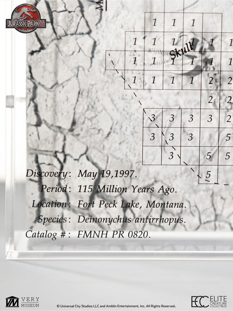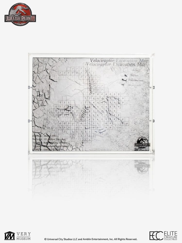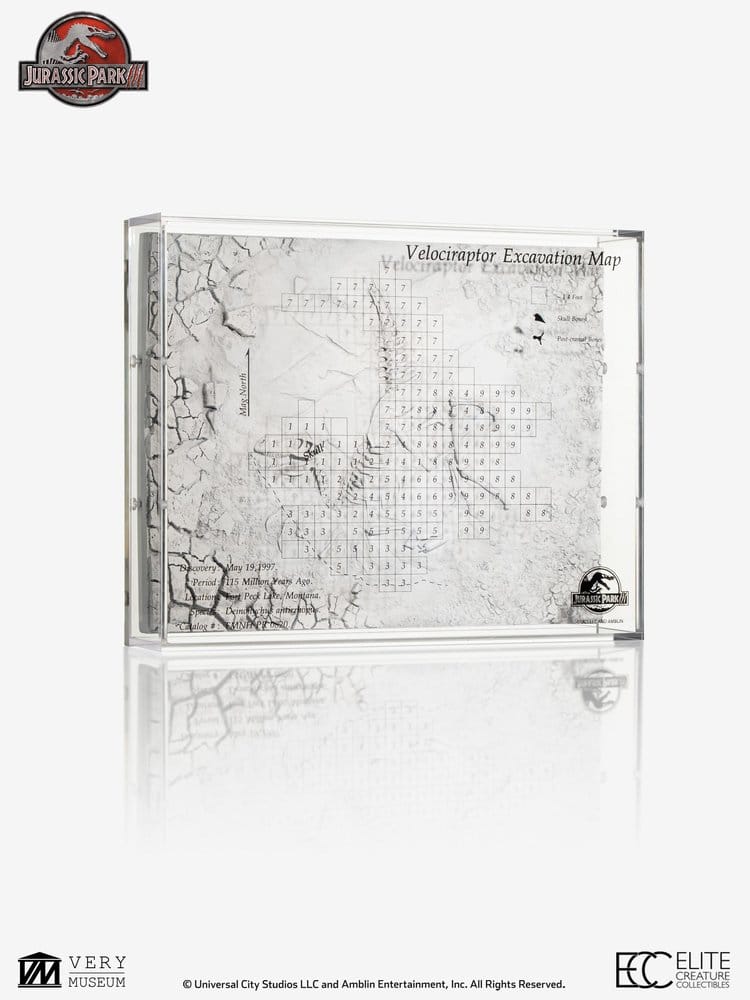 Elite Creature Collectibles is proud to present the Velociraptor Excavation Map, a three-dimensional art display that captures the raptor fossil embedded within rock, complete with excavation tools. Numbered markings on the map indicate the corresponding positions of each bone in the Velociraptor skeleton, offering both visual interest and educational value.