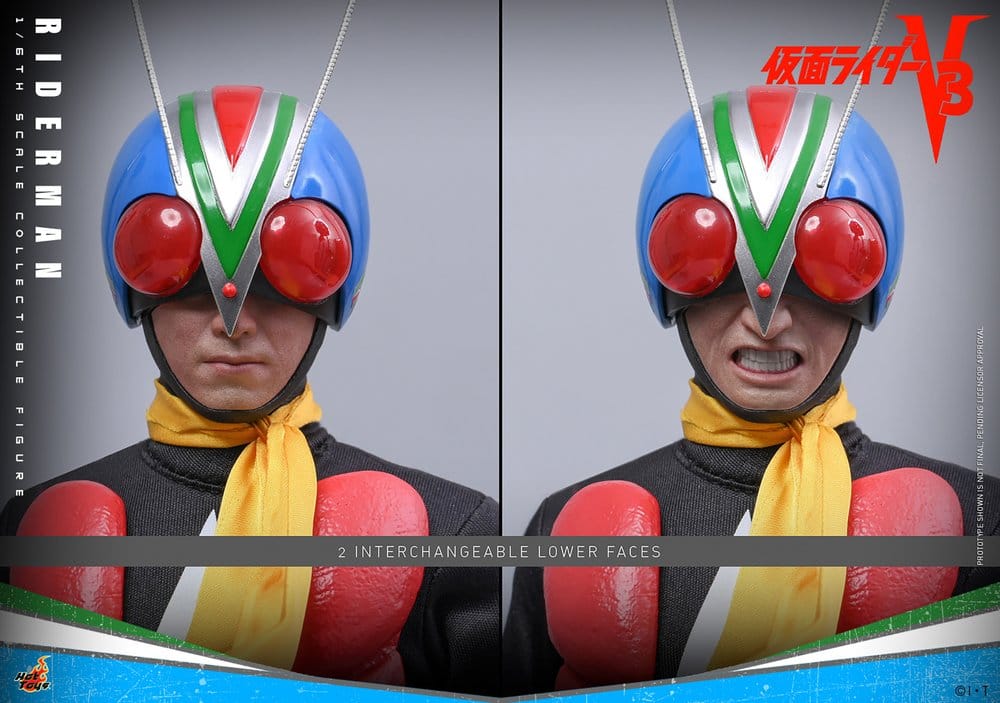 “Farewell, V3! I leave the rest up to you!” – Riderman A former elite scientist of the evil organization Destron, Joji Yuki was betrayed and lost his right arm, only to replace it with a cybernetic prosthetic and take up the mantle of Riderman! Starting as a rival driven by revenge and known as “The Avenging Demon”, he eventually fought alongside Kamen Rider V3 as a hero of justice, rightfully earning the legendary title of “Kamen Rider 4”. With his iconic half-exposed face and versatile “Cassette Arms”, Riderman remains one of the most unique heroes of the Showa era. Sideshow and Hot Toys is thrilled to expand the Kamen Rider collection and introduce the Riderman Sixth Scale Collectible Figure! Masterfully crafted based on the appearance of Riderman in the Kamen Rider V3 TV series, this action figure features a newly developed helmeted head with an authentic likeness of Takehisa Yamaguchi as Joji Yuki. The detailed helmet features a magnetic-activated LED light-up function in the eyes and comes with two interchangeable lower faces to capture his different expressions. Riderman’s costume features a black protective suit with green-and-white printed stripes, paired with red chest armor and silver-colored sleeves and boots made of soft vinyl material. A wire-embedded yellow muffler is also included to allow for dramatic, wind-blown posing. Riderman wouldn’t be complete without his signature weaponry, featuring three sets of interchangeable Cassette Arms: the devastating Power Arm, the Drill Arm, and the highly versatile Rope Arm. The Rope Arm includes a wire-embedded extension rope and multiple attachments (Hook, Sickle, and Maces), allowing fans to seamlessly recreate his Hook Arm, Sickle Arm, and Swing Arm combat modes! To further enhance display potential, the figure also comes with various interchangeable hands, including a special handshake gesture to recreate his iconic bond with the 1/6th scale Kamen Rider V3 Collectible Figure. Complete your Showa Rider display and honor the legacy of Joji Yuki by adding this 1/6th scale Riderman figure to your collection today!