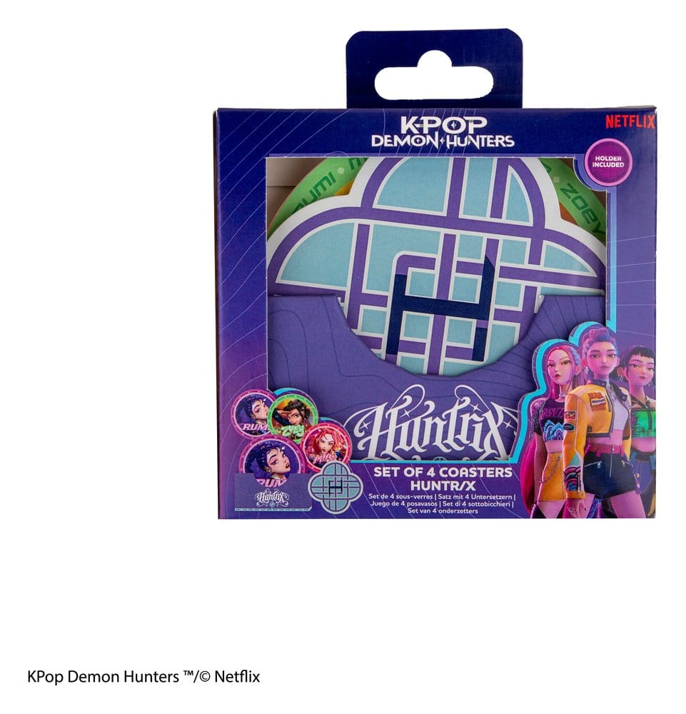 Earn 7 GBCoinsHigh quality Set of 4 Coasters from Cinereplica, licensed by KPop Demon Hunters. This product features HUNTR/X.