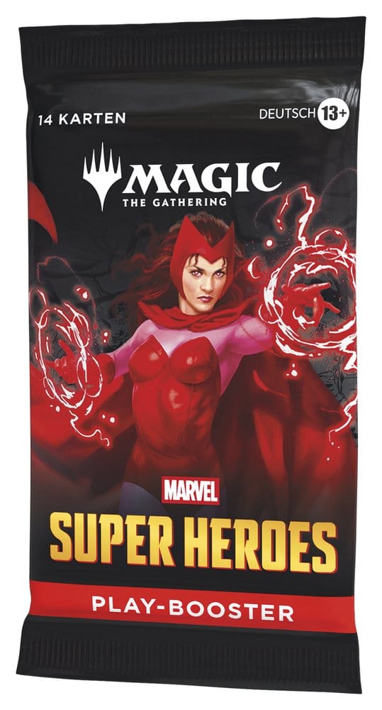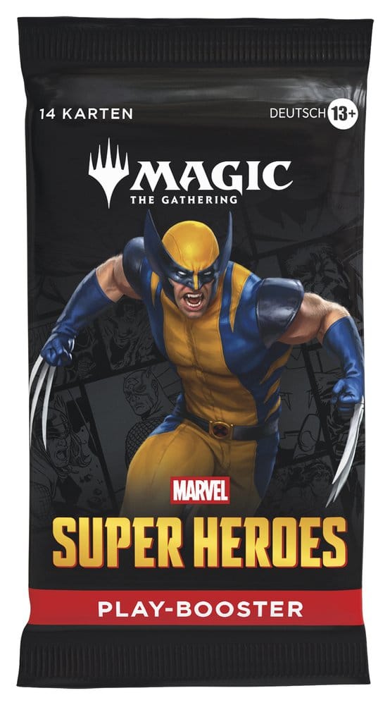 The Marvel Universe has arrived in full force! An all-star roster of heavy hitters jumps from the comics to the battlefield, and the fate of the world hangs in the balance. Soar, strike, and smash your way to victory in Magic: The Gathering Marvel Super Heroes! Play Boosters are perfect for playing with friends and opening packs just for fun. Each pack contains 14 cards, including 1–4 cards of rarity Rare or higher and 3–5 Uncommon, 6–9 Common, and 1 Land cards. 1 card of any rarity is Traditional Foil. Foil Borderless Mythic in <1% of boosters. Traditional Foil Land replaces a Land in 20% of boosters.