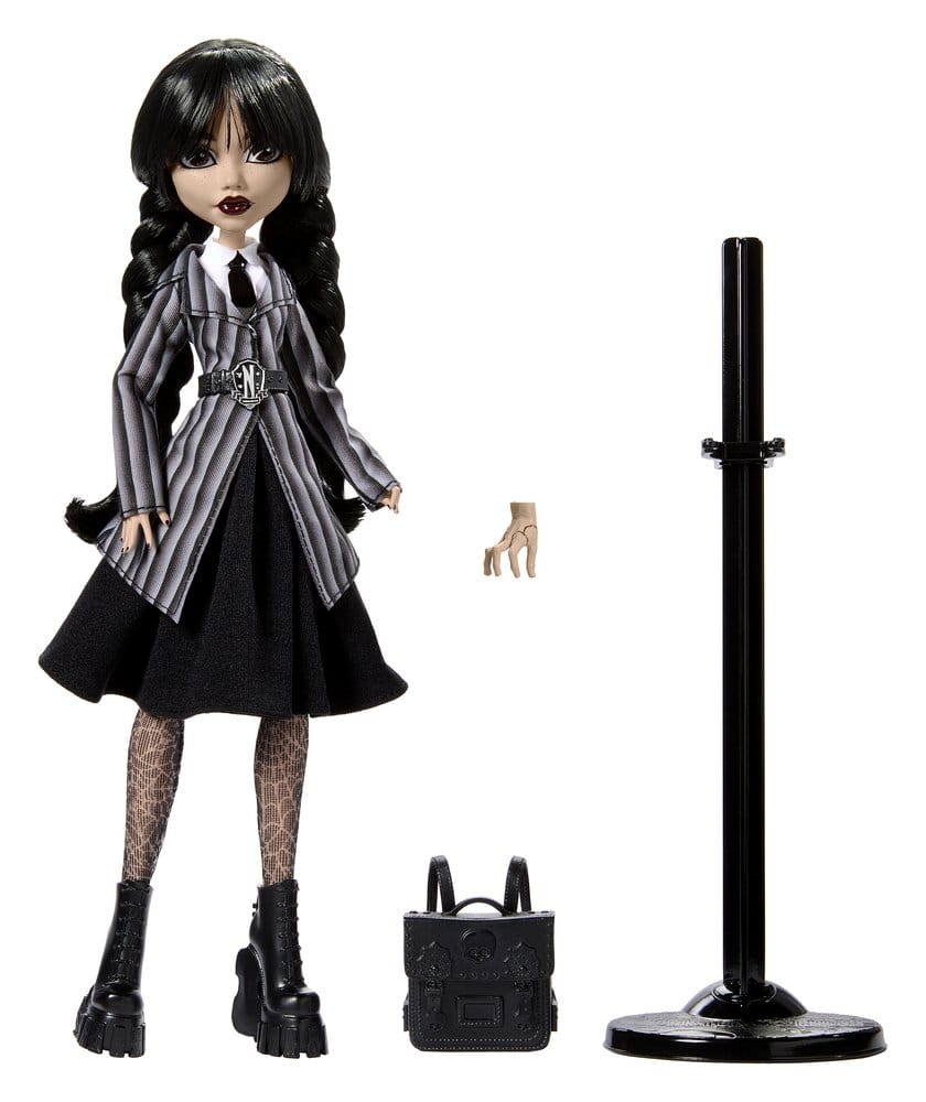 Earn 49 GBCoinsThe creators of Monster High and Wednesday have teamed up to create a spooky-chic doll series inspired by the hit television series. Dressed in black from head to toe, this Wednesday Addams collectible doll exudes dark charm in her Nevermore Academy uniform. With the Ice Cold Hand on her shoulder and killer shoes on her feet, she is more than ready to uncover all the morbid secrets that await her. The doll cannot stand on its own. Doll stand incl