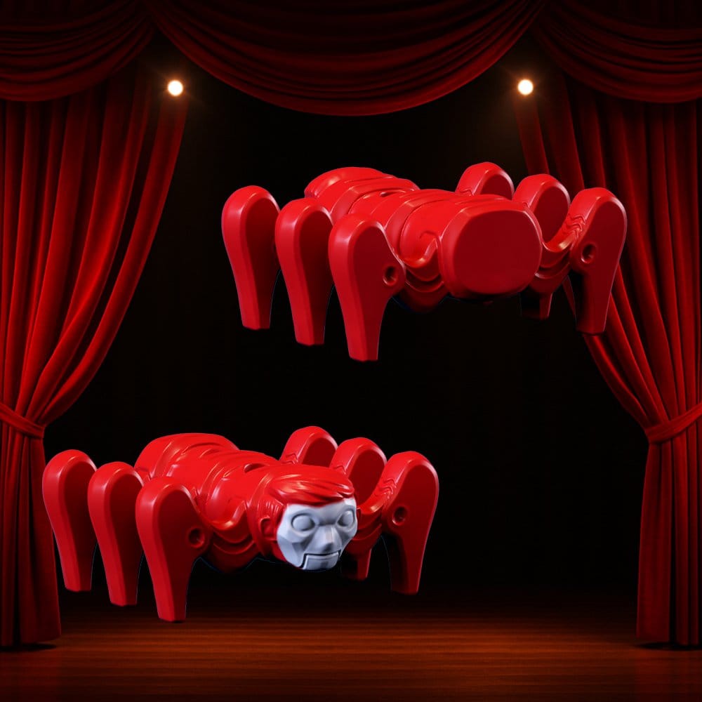 The eye transforms into a projector that shows the past, while the red curtain, floor lights, and the layers of shadows come together to form an eerie theater.