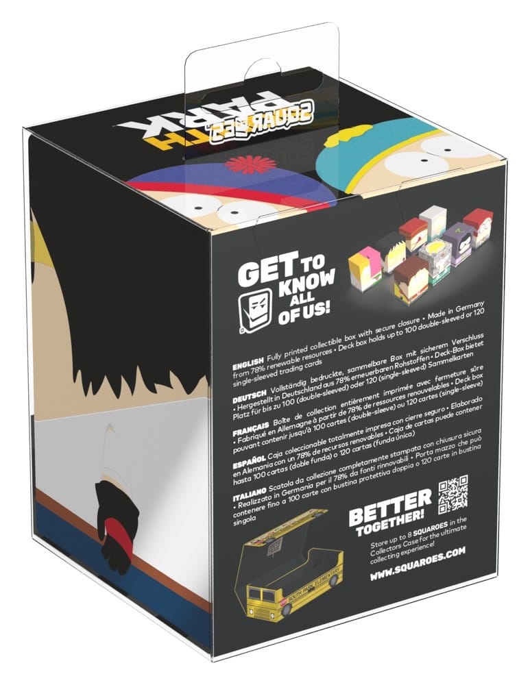 Squaroes by Ultimate Guard are the next generation of TCG gaming accessories! Crafted from high-quality, 78% sustainable materials they combine outstanding card protection with collectibility through exclusive designs, limited one-off printings, and deck boxes available in varying rarities. The South Park™ Squaroes hold up to 100 standard- or Japanese-sized trading cards (from games like Magic: The Gathering, Pokémon, Lorcana, Flesh and Blood, Yu-Gi-Oh!, Riftbound, and One Piece) in double protective sleeves*. As a new spin on Ultimate Guard’s fan-favorite Boulder deck box, Squaroes offer an ultra-sturdy case with a secure closure, while staying easy and convenient to open.