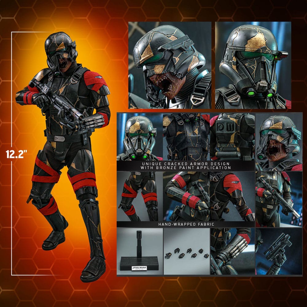 The highly-accurate Star Wars collectible figure is specially designed based on the appearance of the Death Troopers in Ahsoka. It is approximately 31cm tall, featuring a unique cracked armor design with weathering effects and bronze paint applications, interchangeable damaged helmet revealing the decaying jaw underneath, red fabric ribbons wrapped around the body, a blaster rifle, and a display stand.