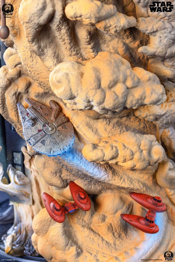 The Boba Fett Fine Art Bust stands over 20″ high and centers on a faithful recreation of the bounty hunter’s iconic helmet. Surrounding the helmet are beautifully sculpted scenes depicting important moments in this fan-favorite character’s history including the tragedy of his childhood and his pivotal capture of the rebel, Han Solo. The bust also includes a recreation of Cloud City, the floating metropolis that serves as the setting for so many beloved story moments, wreathed in orange clouds that transition to an ethereal vision of the Mandalorian crest seeming to form in the atmosphere.