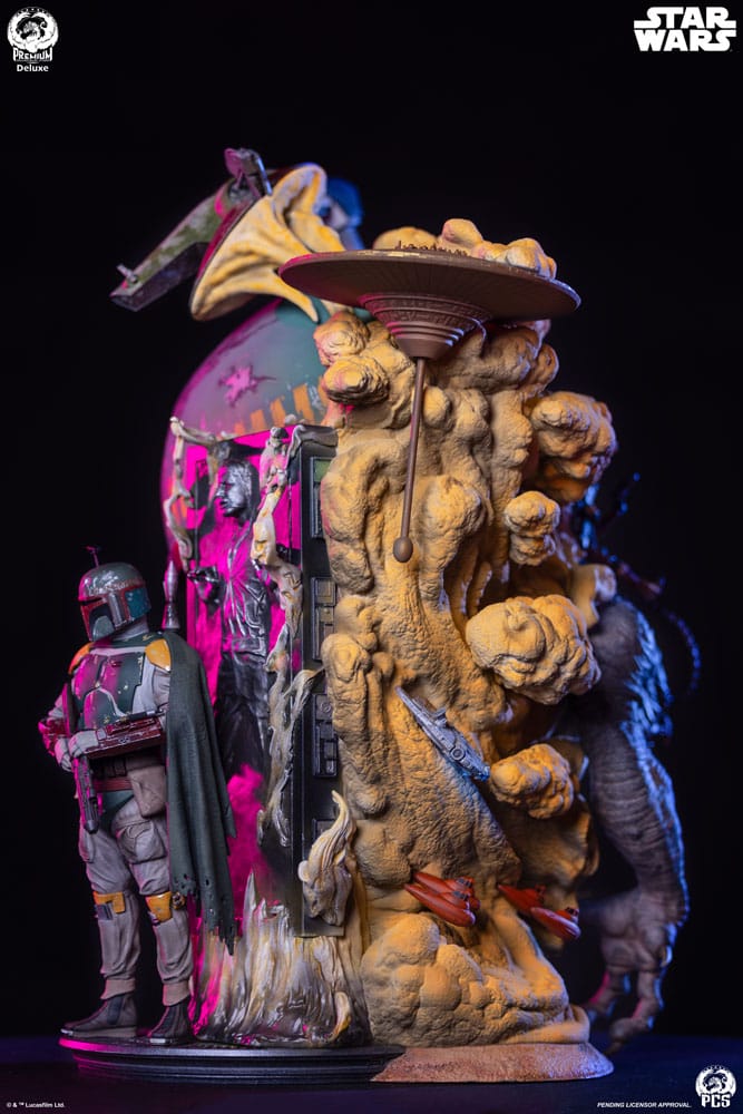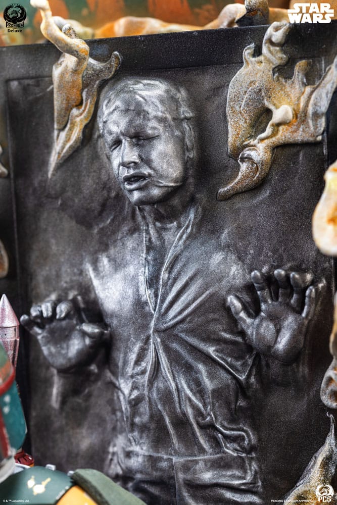 The Boba Fett – Fine Art Bust Deluxe Edition features LED light up features to add an extra sense of excitement and drama to this already staggering piece. The warm glow emanating from beneath the floors of the carbonite freezing chamber illuminates a highlight of this piece, a statue of the disquietingly stoic Boba Fett standing beside his frozen quarry.
