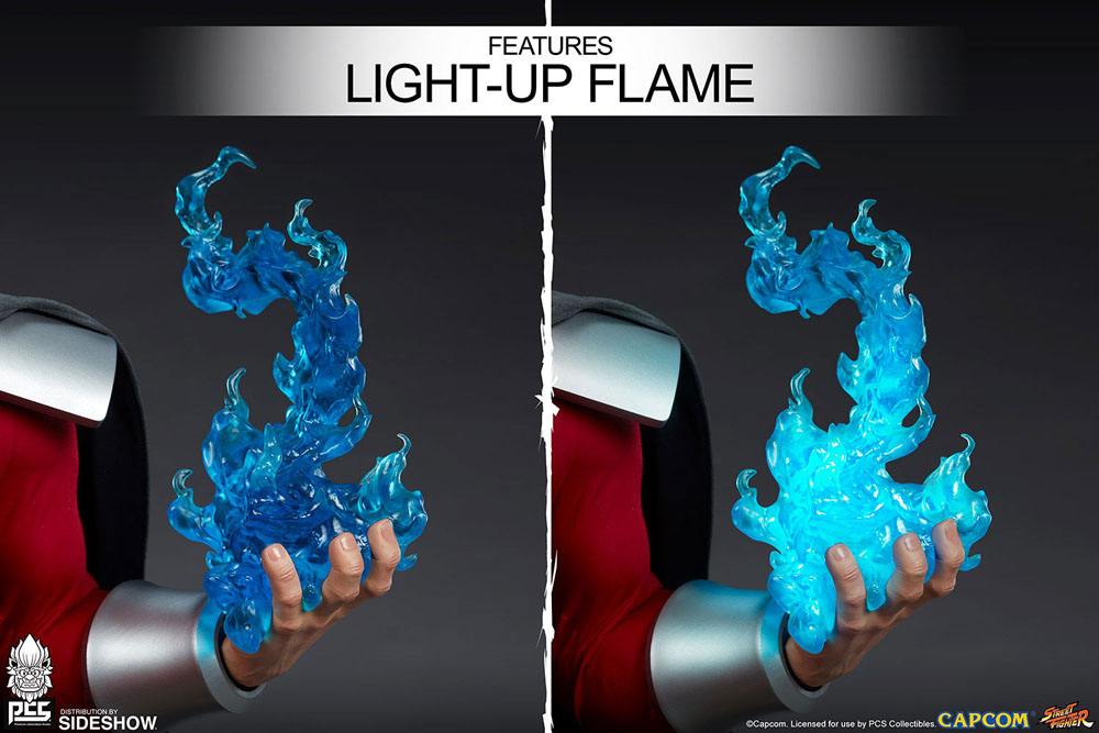 The mixed media M. Bison 1:3 Scale Statue includes a number of detailed swap-out elements that allows collectors to choose a winning combo for display. The maniacal dictator comes with one stoic portrait and one grinning portrait, each with a detailed facial sculpt, white eyes, black hair, and a sculpted red cap, blending the game’s animated style with incredible realism. M. Bison also includes two interchangeable left hands, one with an open-handed gesture and one with a blue flame effect as he charges his Psycho Power for a devastating attack. Both portraits and the flame-hand feature LED light-up capability for an even more engaging presentation.