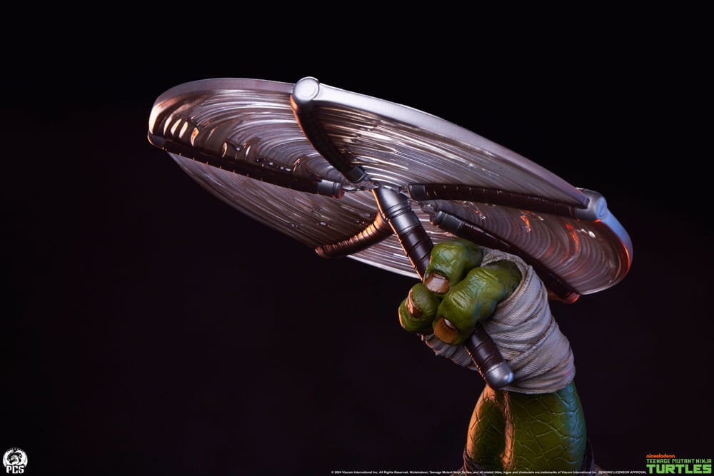 This fully sculpted statue features protective pads on his knees and elbows, cloth wraps around his hands and feet, and a leather belt decked out with a ton of pouches to hold his ninja accessories…or more likely, snacks. The wide grin on his face and his orange mask fluttering in the breeze enhance the sense of movement and fun that makes Michelangelo such a fan favorite.