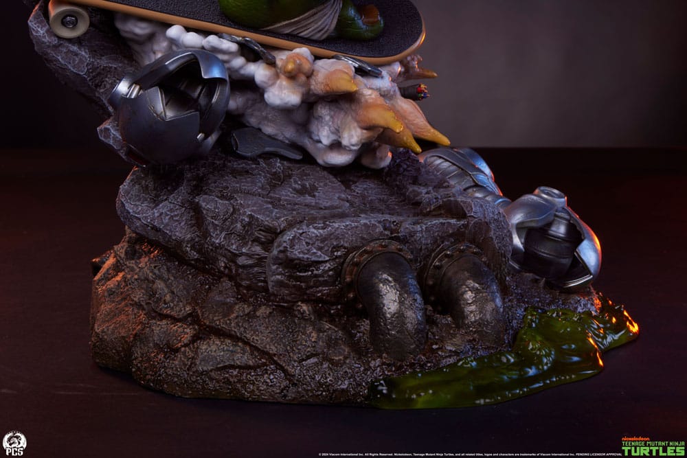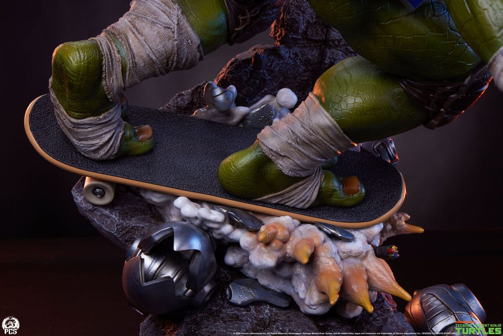 The Michelangelo 1:3 scale statue measures 26.5″ tall and nearly 19″ wide as this fun-loving turtle whirls his nunchucks while carving through the NYC sewer system on his skateboard.