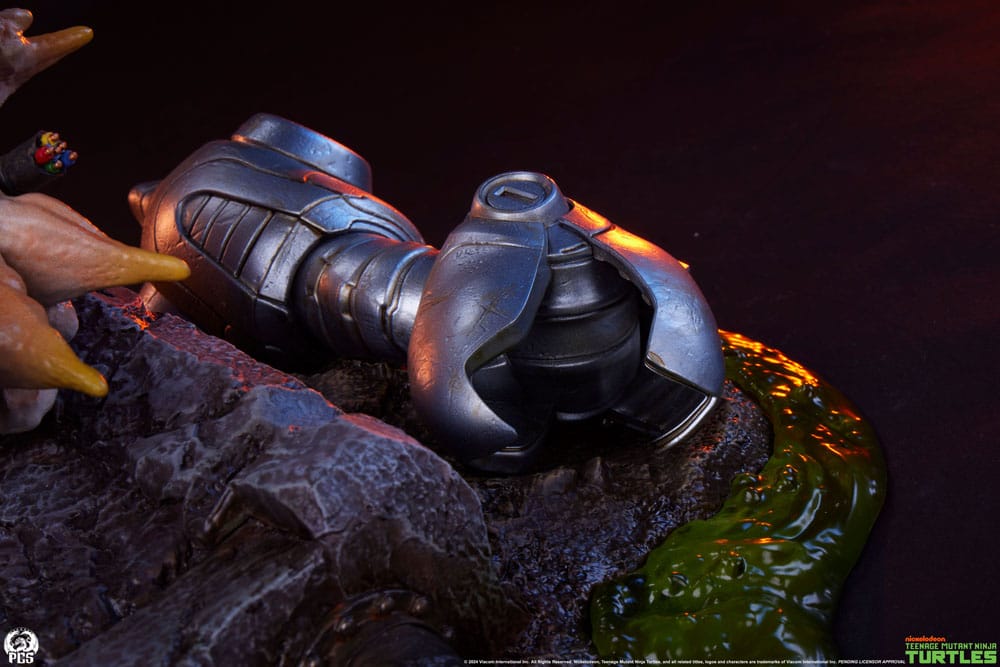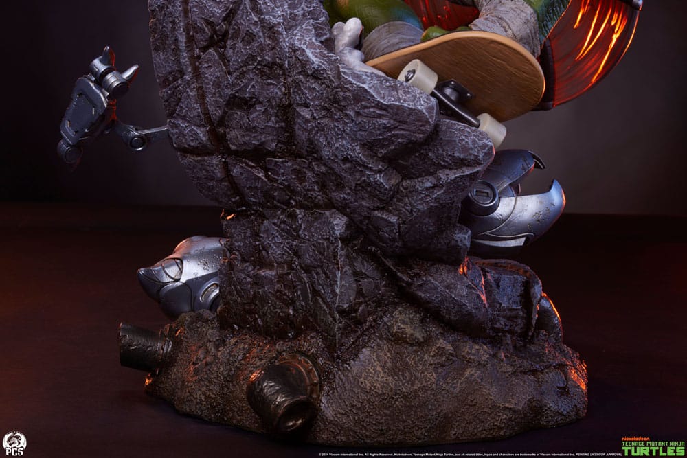 The Michelangelo statue is carefully crafted to showcase a stylized mixture between his more realistic and comic styled depictions. With detailed paint work and design, you can see each scale on his body, every cut of his shell, and his battle-hardened physique from his many clashes with the TMNT rogues’ gallery alongside his brothers Leonardo, Raphael, and Donatello.