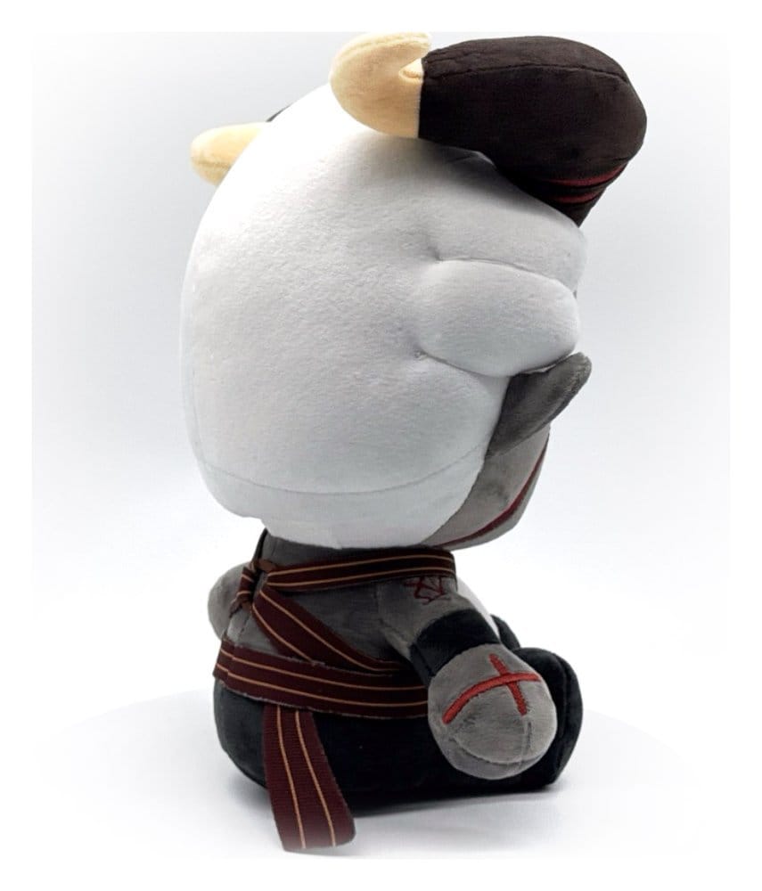 From the world of Regolus: Dark Age, Katari has emerged! Sitting at 9 inches tall with her legs kicked forward and dressed in black shoes and pants with a red and yellow striped belt that matches an X-shaped bandeau top, her grey skin is covered with red tattoos that run over her arms, chest and stern face. With long white hair pulled back into a long braid that falls over her shoulder, a pair of curved horns poke out from the top of her head and have red marking and yellow tips. This plush is packed to the seams with 100% PP cotton and is made of minky and tricot materials with accents of felt, perfect for cuddling!