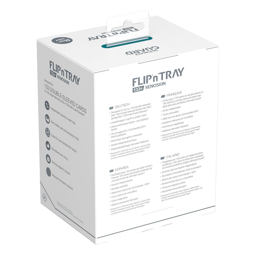 The latest version of Ultimate Guard’s legendary Flip’n’Tray offers even more space: The Flip’n’Tray 133+ Xenoskin fits up to 133 double-sleeved cards, thanks to the integrated extra compartment for dice, the deck box is perfect for Commander/EDH decks and is the optimal companion for Magic: The Gathering players at Limited Events. But fans of other TCGs like Pokémon or Flesh and Blood will also love the spacious and practical deck box with our proven Xenoskin surface!