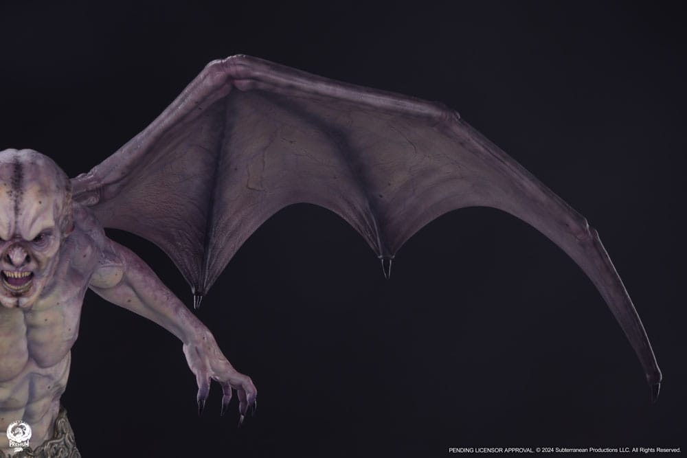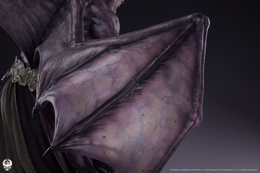 The statue is elevated even further by the incredible paintwork on display. The subtle purple gradation on Marcus’ skin adds depth to his chiseled form and the glossy black finish on his inhuman eyes will send chills down the spine of even the bravest collector. His massive purple-hued leathery wings are detailed with intricate veining that carries through the torso adding a cryptic cohesion to this nightmarish collectible.