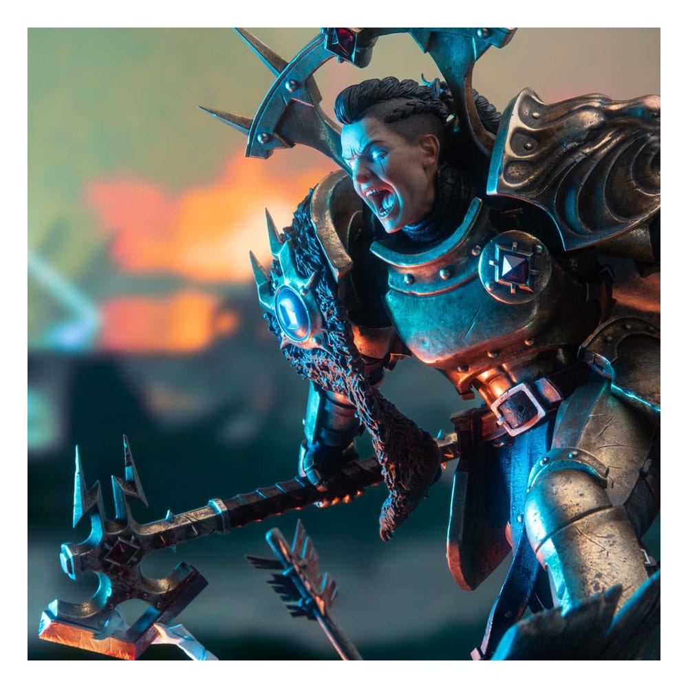 Captured in a single, wrathful instant, Neave Blacktalon storms into battle; golden armour ablaze, axes sparking with lightning, her war cry echoing across the battlefield. Every detail tells the story of Sigmar’s chosen assassin: the splintered war platform beneath her feet, the Orruk helm crushed into the dirt, the storm-forged fury carved into every line of her form.